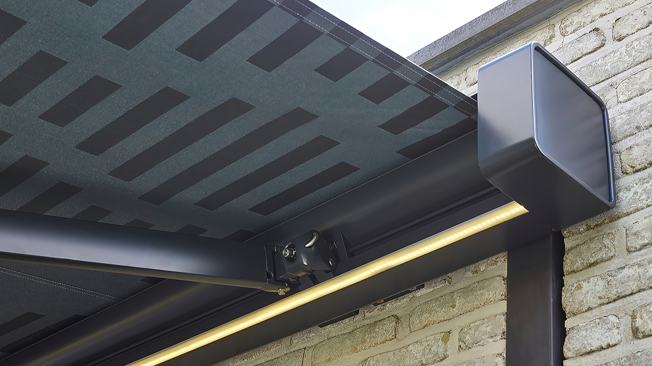 We waren heel tevreden over ons vorige zonnescherm maar nu we al iets ouder zijn, wordt het manueel inrollen van het zonnescherm toch wel wat zwaar. Daarom hebben we een nieuwe Squaro zonnescherm gekocht met elektronische bediening en het Hypnose zonnedoek.